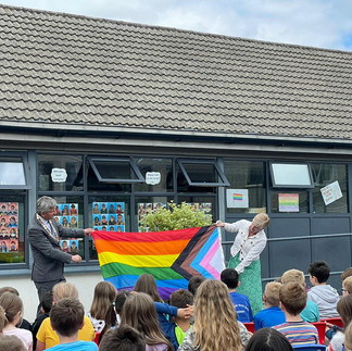 We were very happy and proud today to accept a pride flag which was presented to us by the President of the Irish National Teachers' Organisation (INTO). We all gathered outside for the first time in ages and 6th class told the rest of the school about the pride flag and its origins. The children have been learning about celebrating and embracing difference and we are proud to be an inclusive school.